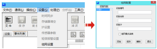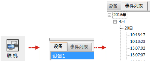 3)完成以上步骤后,点击软件快捷菜单图标“联机”,然后点击软件界面左边“设备”,双击“设备1”,软件将会把仪器内数据刷新在“事件列表内”