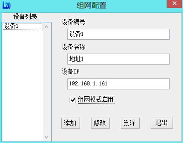 2)将仪器添加进软件设备列表,双击左边设备列表内“设备1”,将仪“设备IP”处修改为仪器IP地址:192.168.1.161(注意:这里添加的IP地址为仪器显示屏上的IP地址)并在“组网模式启用”前打上“√”,点击“修改”,然后“退出”。