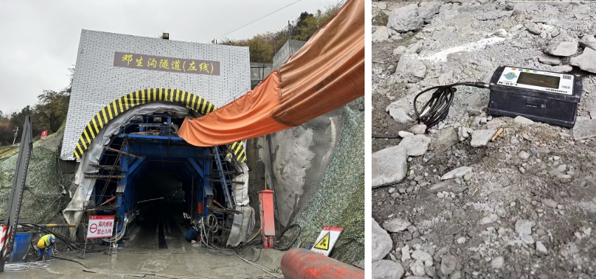 2、解决方案:2023年7月19日我司检测人员在都江堰至四姑娘山山地轨道交通工程布设检测设备对隧道开挖振动数据、隧道开挖噪声数据进行监测。振动检测共布设6个振动测点,各个检测点到振源的距离分别为10m、15m、20m、25m、30m、35m。噪声检测中共布设3个噪声测点,分别位于洞口位置、距洞口20米处和距洞口50米处。